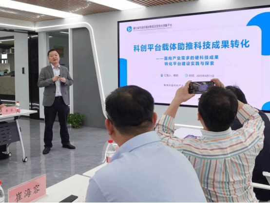 先创平台总经理杨明向崔海容副校长一行详细介绍了先创平台建设概况、运营模式、发展规划,以及在创新转化实践中取得的成绩,并重点介绍了平台转化的多项技术成果案例。